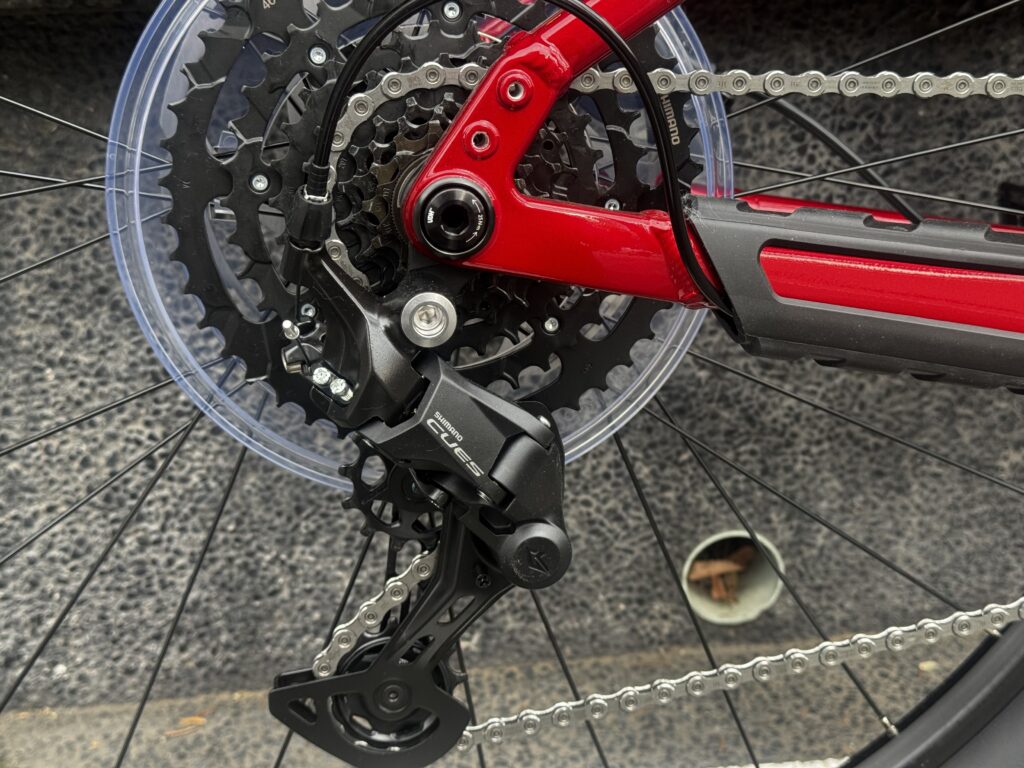 シマノCUESのコンポーネントを搭載。LINKGRIDEというテクノロジーにより、これまでのHG(ハイパーグライド)に比べて、3倍の耐久性と変速のスムーズさを誇ります。